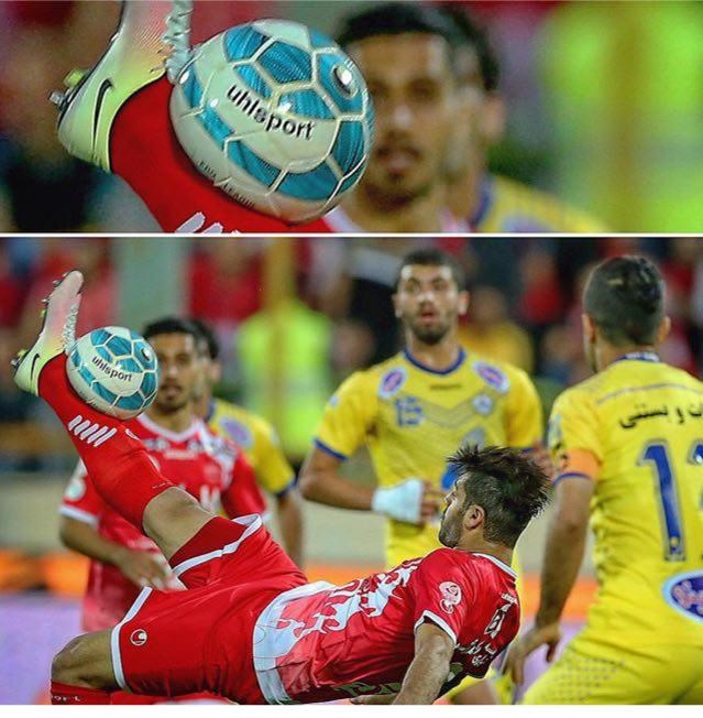خبرطلایی؛ این یکی از صحنه های دیدار پرسپولیس و نفت است. توپ کم باد و تلاش طارمی برای زدن قیچی برگردان با همین توپ!